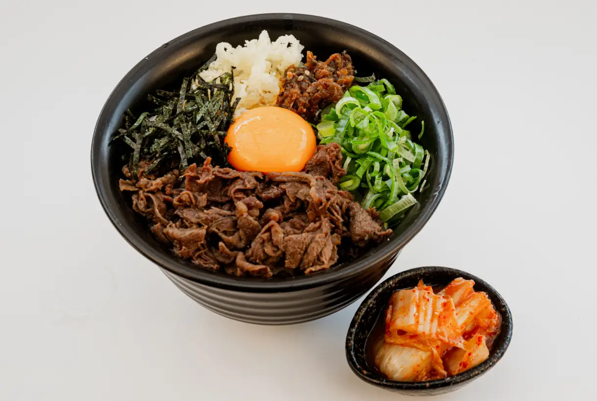 和牛あか牛最上級ブランド「延寿牛」の柔らかくて、脂身が甘くさっぱりとした広島県民のソールフード「コウネ」を、北広島町で大切に育てられ、店内精米した「あきろまん」の上に