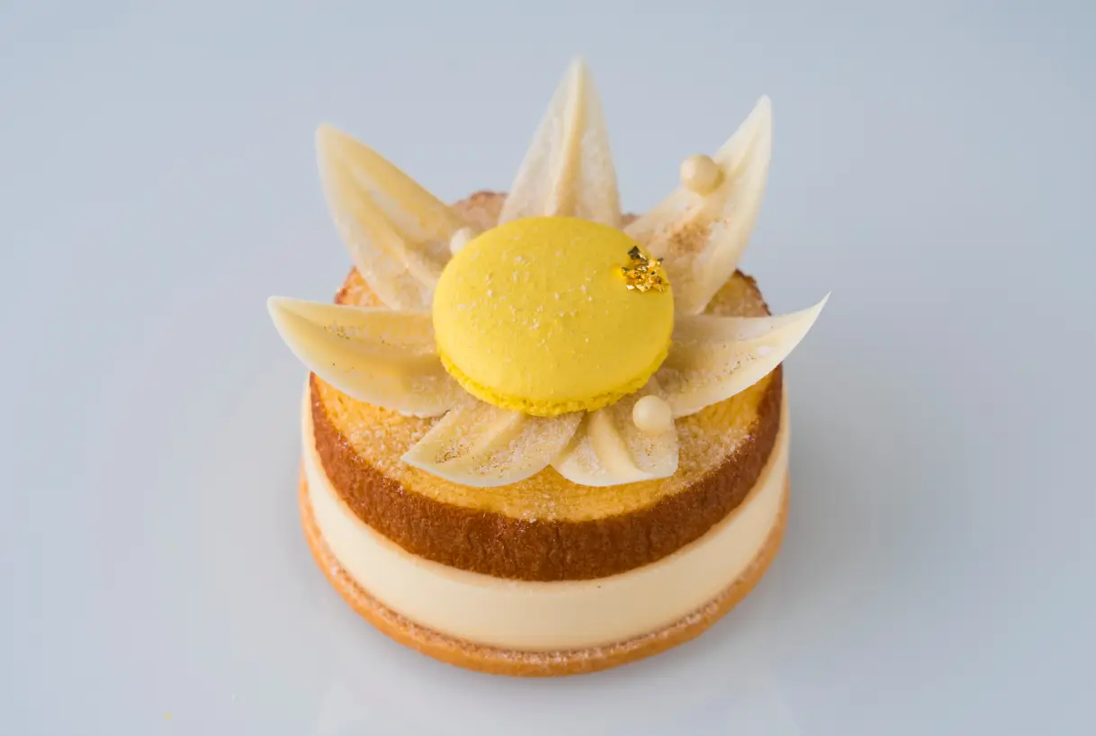 しっとりとしたバウムクーヘンに濃厚なクリームチーズムースとさっぱりとしたリンゴのコンポートを組み合わせ、バームクーヘンの豊かな風味としっとりとした食感をお楽しみいただけるよう工夫しました。見た目も華やかにホワイトチョコレートと黄色いマカロンをデイジーに見立てて施しています。