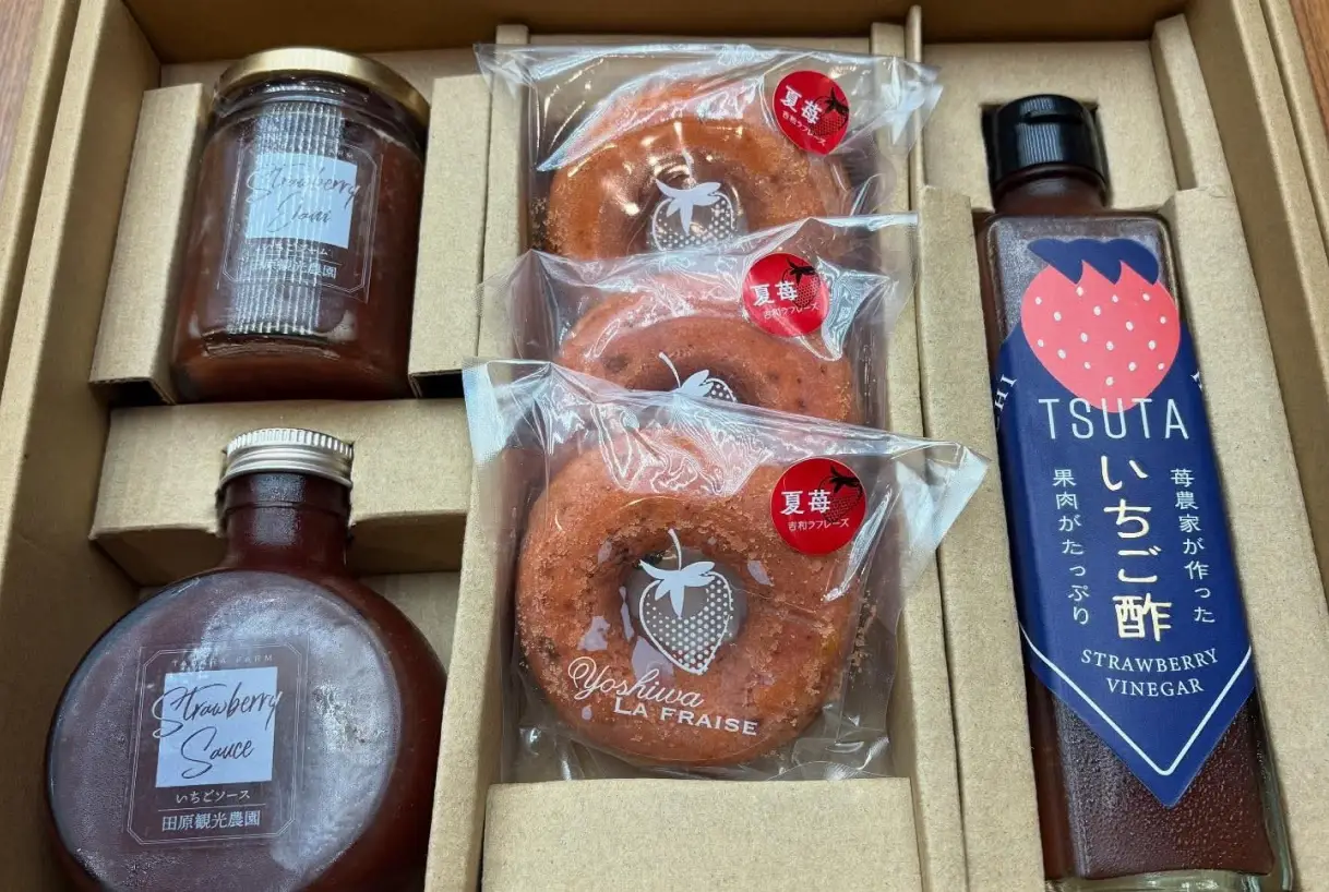 農家が自信をもってオススメするおいしい苺を使った商品には、田原農園の「いちごジャム・いちごソース」、吉和ラフレーズの「冠苺ドーナツ・夏苺スムージー」、ワイ・ワイファームの「いちご酢」等があり、佐伯・吉和の道の駅やスーパー・キッチンカーなどでお求めいただけます。